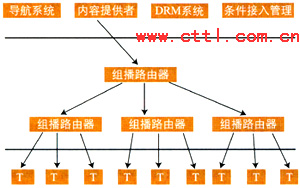IPTV業(yè)務提供者可以根據(jù)用戶的請求,利用IP網(wǎng)絡本身所提供的組播能力將視頻信息以組播的方式傳送給用戶。此時,同時向相同的業(yè)務提供者請求發(fā)送相同內容信息的用戶,可以由業(yè)務提供者安排在同一個組播組中接收到相同的信息。為給內容提供者提供知識產(chǎn)權保護,業(yè)務提供者提供條件接入控制。同時為減少骨干網(wǎng)絡傳輸?shù)膲毫,業(yè)務提供者在向眾多的用戶提供組播式業(yè)務時可以利用多級組播的形式來實現(xiàn)。組播式IPTV業(yè)務可能的系統(tǒng)模型示意如圖1所示。