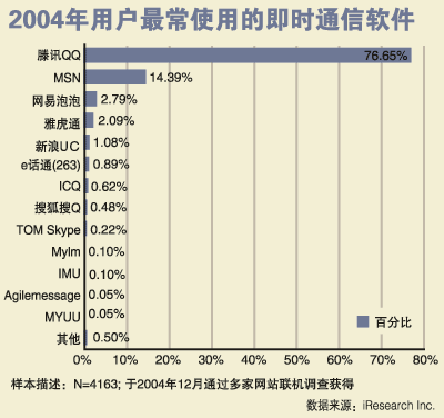 面對國外IM市場的火爆,我國IM軟件市場的發(fā)展前景更加令人充滿期待,據(jù)騰訊公司統(tǒng)計數(shù)據(jù)顯示,目前騰訊QQ的注冊賬戶已經(jīng)突破了4億,活躍用戶達(dá)到了1.5億,而最高同時在線賬戶也突破了1500萬戶大關(guān)。