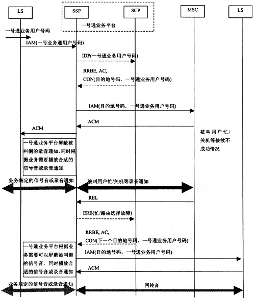 基于目前現(xiàn)網(wǎng)的信令處理方式,當一號通業(yè)務用戶所設定的目的地號碼為移動用戶時,如果出現(xiàn)被叫用戶忙、關機等接續(xù)不成功情況,現(xiàn)有的移動交換機會給主叫用戶播放錄音通知,通知用戶,如果主叫用戶不掛機,則在通知播放完畢后向前端交換機后向返回REL消息,釋放呼叫。一號通業(yè)務平臺收到釋放消息后根據(jù)業(yè)務需要,進行下次接續(xù)。如果按照原有的信令流程,主叫用戶會先聽到被叫用戶忙或關機的錄音通知,然后又聽到下一個呼叫的回鈴音。為了避免出現(xiàn)這種現(xiàn)象,一號通業(yè)務平臺要能夠屏蔽被叫側播放的錄音通知和信號音,并根據(jù)業(yè)務需要向主叫用戶播放合適的信號音或錄音通知,具體的屏蔽方式由一號通平臺自行確定。以智能網(wǎng)實現(xiàn)、ISUP消息為例,具體的消息流程如圖3所示。