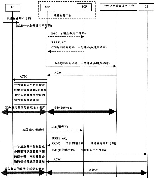 按照圖3所示的信令方式,一號通業(yè)務平臺屏蔽被叫側錄音通知后,如果被叫用戶申請了個性化回鈴音業(yè)務,則會產(chǎn)生一號通業(yè)務與個性化回鈴音業(yè)務之間的互斥性,即如果一號通業(yè)務用戶所設定的目的地號碼申請了個性化回鈴音業(yè)務,個性化回鈴音業(yè)務平臺給主叫用戶播放的錄音通知會被一號通業(yè)務平臺所屏蔽,主叫用戶將聽到由一號通業(yè)務平臺統(tǒng)一播放的信號音或錄音通知,而聽不到個性化回鈴音。以智能網(wǎng)實現(xiàn)、ISUP消息為例,具體的消息流程如圖4所示。