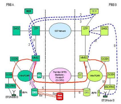 用戶A發(fā)送MM消息給用戶B。MM消息通過網絡A的SGSN(Serving GPRS Support Node)、GGSN(Gateway