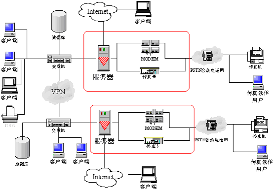 上圖中紅色框架為gotoneFax系統(tǒng)。它可以很方便的融入目前企業(yè)的網絡中,擴張您目前網絡的功能,為您提供及時的服務。當然這也是我們的愿望。