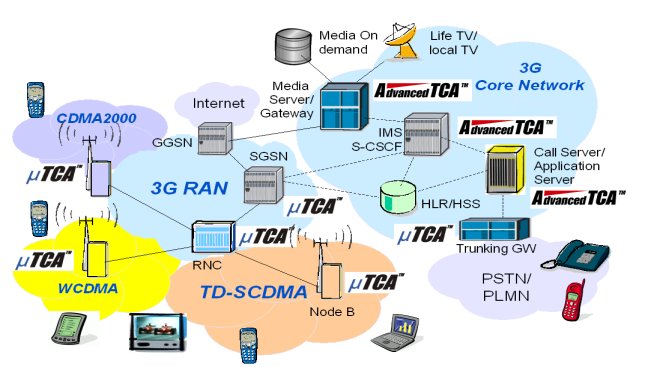 3G網(wǎng)絡(luò)中占主要地位的三個(gè)無線接入標(biāo)準(zhǔn)是WCDMA、TD-SCDMA與CDMA2000。3GPP與業(yè)界廠商對(duì)網(wǎng)絡(luò)結(jié)構(gòu)的標(biāo)準(zhǔn)化做出的杰出努力,為在世界范圍內(nèi)成功布署3G網(wǎng)絡(luò)業(yè)務(wù)起到了至關(guān)重要的作用。不過,3G網(wǎng)絡(luò)是復(fù)雜的系統(tǒng),包含有多種多樣的網(wǎng)元設(shè)備,AdvancedTCA與MicroTCA技術(shù)的出現(xiàn)把它的實(shí)現(xiàn)方式引向了標(biāo)準(zhǔn)化的道路,即通過商用組件快速、低成本地布署3G網(wǎng)絡(luò),減少了各種獨(dú)立的實(shí)現(xiàn)方式的復(fù)雜性,提高了互操作性。