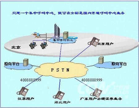 企業(yè)希望通過呼叫中心向客戶提供客戶服務(wù),原來沒有呼叫中心平臺,則應(yīng)用中國電信"一碼通"業(yè)務(wù),只建一個集中呼叫中心,便可在全國范圍內(nèi)開通呼叫中心業(yè)務(wù)。企業(yè)應(yīng)用該方案,初期投資只包括一個呼叫中心平臺,從而實現(xiàn)投資少、見效快、迅速開拓業(yè)務(wù)市場的目的。