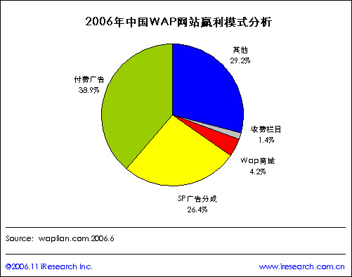 根據(jù)waplian.com統(tǒng)計(jì)數(shù)據(jù)顯示,2006年中國WAP網(wǎng)站贏利模式分析情況,付費(fèi)廣告和SP廣告分成是WAP網(wǎng)站贏利模式的最主要兩種形式,比例分別為38.9%和26.4%,另外WAP商城和收費(fèi)欄目的贏利模式也占一定份額比例,分別為4.2%和1.4%。