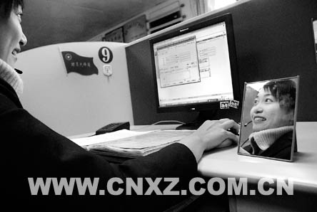 12319服務(wù)熱線中心有13個(gè)工作臺(tái),每個(gè)工作臺(tái)前都有一面鏡子。該中心的負(fù)責(zé)同志說(shuō),這面鏡子是檢驗(yàn)工作人員是否微笑服務(wù)的“晴雨表”。鏡子是今年初安裝的,大家還給它起了一個(gè)響亮的名字:“微笑鏡”。