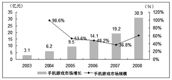 國(guó)內(nèi)手機(jī)游戲市場(chǎng)在過去的幾年里呈現(xiàn)快速發(fā)展的趨勢(shì)。2004年增長(zhǎng)率接近100%,2005年也有50%以上的增長(zhǎng)。但最近兩年國(guó)內(nèi)整個(gè)手機(jī)游戲市場(chǎng)隨著手機(jī)普及率的增速放緩也進(jìn)入了盤整期。iResearch咨詢估計(jì),從2005年至2007年,國(guó)內(nèi)手機(jī)游戲市場(chǎng)的收入規(guī)模盡管仍然處于上漲趨勢(shì),但年增長(zhǎng)率逐年下降,2008年后隨著市場(chǎng)環(huán)境更加成熟理性,年增長(zhǎng)率將會(huì)出現(xiàn)反彈,升至60%以上。
