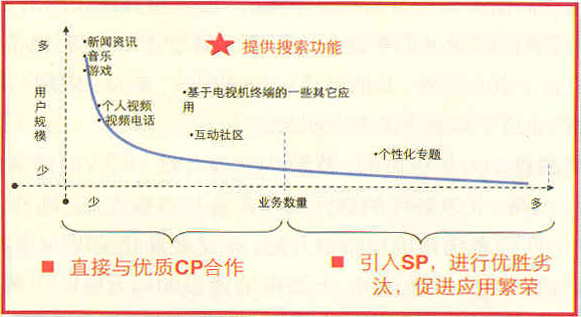 增值業(yè)務(wù)內(nèi)容定位可參考長尾理論模型。長尾理論的頭部通常是大眾市場,要求產(chǎn)品滿足用戶符號化的需求,主流業(yè)務(wù)將具備更廣的流行效應(yīng),如新聞、游戲和音樂,頭部的業(yè)務(wù)往往能夠滿足大規(guī)模用戶需求,提供優(yōu)質(zhì)業(yè)務(wù)體驗;尾部通常是細(xì)分市場和互動市場,要求業(yè)務(wù)滿足生產(chǎn)與消費(fèi)一體化的需求,體現(xiàn)交互性,為用戶帶來整合的、一對一的體驗,以促進(jìn)IPTV應(yīng)用繁榮。