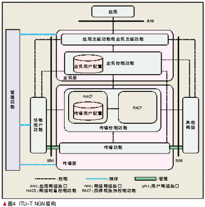 ITU-T下一代網(wǎng)絡的主要架構(gòu)如圖4所示,NACF是NGN傳輸層的功能實體,正對應于TISPAN NGN架構(gòu)中的NASS。
