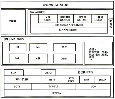 通過對(duì)于IMS客戶端相關(guān)規(guī)范的研究與分析,可以看出IETF提供了IMS客戶端所需要的協(xié)議部分,包括詳細(xì)的SIP信令消息交互,服務(wù)參數(shù)協(xié)商、媒體流的建立、XML文檔的交互等。3GPP和OMA提供了IMS客戶端所需要的服務(wù)引擎,與不同應(yīng)用服務(wù)器之間的交互方式以及如何接入到IMS網(wǎng)絡(luò)等。JCP提供了一整套IMS客戶端上Java應(yīng)用程序所需的標(biāo)準(zhǔn)Java應(yīng)用編程接口。由此可以總結(jié)歸納出IMS客戶端軟件架構(gòu)參考,具體參見圖2。