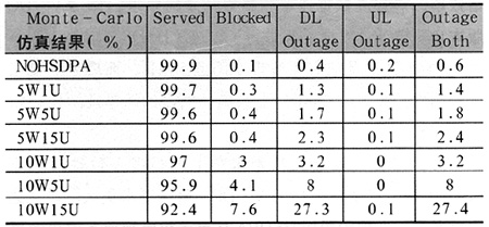 通過表3可以看出,隨著HSDPA功率分配的增加,網(wǎng)絡(luò)阻塞率和下行鏈路功率過載隨之增加,特別是功率增加到10W時(shí),增加幅度尤為明顯;在一定的HSDPA功率分配前提下,隨著網(wǎng)內(nèi)HSDPA用戶數(shù)的增加,網(wǎng)絡(luò)阻塞率和下行鏈路功率過載隨之增加,特別是用戶數(shù)增加到15人時(shí),增加幅度尤為明顯。可見HSDPA網(wǎng)絡(luò)性能在一定程度上受限于HSDPA功率分配和網(wǎng)內(nèi)HSDPA用戶數(shù)。