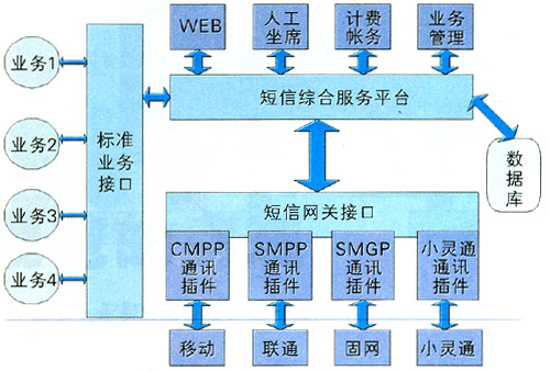 業(yè)務(wù)管理平臺(tái)是為運(yùn)營(yíng)商提供的可快速啟動(dòng)各種數(shù)據(jù)業(yè)務(wù)的平臺(tái),具有強(qiáng)大的資源調(diào)度能力。它連接運(yùn)營(yíng)商的基礎(chǔ)網(wǎng)絡(luò)和業(yè)務(wù)支撐系統(tǒng)(客服系統(tǒng)、計(jì)費(fèi)系統(tǒng)),為服務(wù)提供商/內(nèi)容提供商們提供各種移動(dòng)資源(如短信息中心資源、用戶信息資源、語音資源等)、功能資源(如單點(diǎn)認(rèn)證、計(jì)費(fèi)、漫游控制等)及各種公共的資源引擎(如地理位置、語音交互、推送信息等)。業(yè)務(wù)支撐系統(tǒng)是運(yùn)營(yíng)商為了開展業(yè)務(wù)必須建設(shè)的客服系統(tǒng)、營(yíng)業(yè)系統(tǒng)、計(jì)費(fèi)系統(tǒng)等子系統(tǒng)。圖3是目前常用的綜合短信平臺(tái)[3]。