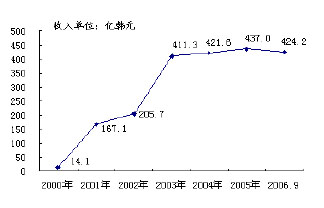 經(jīng)過6年多的運(yùn)營,韓國電信的eBilling業(yè)務(wù)發(fā)展良好,目前與其合作的ICP已達(dá)到500多家,內(nèi)容涵蓋了收費(fèi)郵箱、在線軟件銷售、聊天、娛樂、游戲、漫畫、綜合信息等;業(yè)務(wù)收入也逐年上升,從2000年的14.1億韓元(折合人民幣0.11億元)增長到2006年9月份的424.2億韓元(折合人民幣3.3億元),如圖2、圖3所示。