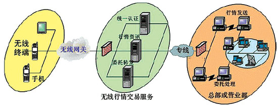 無(wú)線終端的請(qǐng)求通過(guò)各無(wú)線網(wǎng)絡(luò)進(jìn)入移動(dòng)證券系統(tǒng)的無(wú)線接入網(wǎng)關(guān),經(jīng)無(wú)線網(wǎng)關(guān)轉(zhuǎn)發(fā)至移動(dòng)交易行情服務(wù)平臺(tái)。如果是讀取行情資訊,行情服務(wù)平臺(tái)直接提供行情資訊服務(wù);如果是進(jìn)行委托交易,由委托接入服務(wù)器將委托數(shù)據(jù)轉(zhuǎn)發(fā)到總部或營(yíng)業(yè)部,再由總部或營(yíng)業(yè)部交易處理服務(wù)平臺(tái)進(jìn)行處理。換句話說(shuō),在無(wú)線網(wǎng)關(guān)接入后,其后的委托服務(wù)、行情服務(wù)都可采用現(xiàn)有的網(wǎng)上交易的通道和系統(tǒng)。