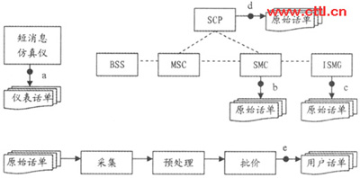 通過對移動點對點短消息計費原理的分析,可以把整個計費過程劃分為兩大環(huán)節(jié):計費點原始話單的生成和后期計費處理系統(tǒng)的處理。如果其中任何一個環(huán)節(jié)出現差錯都會降低用戶計費話單的準確性。因此在測試過程中采取了用戶層面和設備層面相結合的方法:一方面使用仿真儀表大量模擬點對點短消息的發(fā)送和接收,得到用戶話單;一方面分析各個計費點生成的原始話單。