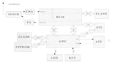 其中,BC04支持最大4個活動連接(包括耳機),同時支持兩路SCO語音,所以語音通過PCM和ASIC PCM相接可以有多路被送到模擬端,從而實現(xiàn)3方通話。ASIC部分實現(xiàn)PCM語音數(shù)據(jù)與模擬語音信號的相互轉(zhuǎn)換,通過發(fā)送和接收PSTN信令,負責對人機界面的控制。它通過GPIO(General