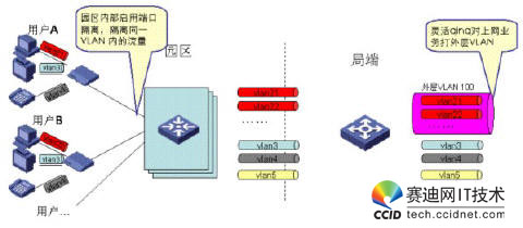 用戶業(yè)務(wù)主要為HSI(上網(wǎng)業(yè)務(wù))、IPTV業(yè)務(wù)和VOIP業(yè)務(wù),每種業(yè)務(wù)對(duì)網(wǎng)絡(luò)的要求各不相同,為了便于QOS和安全策略的部署,因此我們必須將業(yè)務(wù)進(jìn)行區(qū)分。最簡(jiǎn)單的辦法就是通過(guò)不同VLAN來(lái)標(biāo)記不同的業(yè)務(wù)。