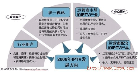 2008年,IPTV市場,因為發(fā)展速度明顯慢于了市場進(jìn)度和技術(shù)演進(jìn)。因此在原有的運營商產(chǎn)業(yè)化推動形勢下,終端廠家推動下的產(chǎn)品化發(fā)展模式也會得到更大的發(fā)展空間,而這在一定程度上雖會推動用戶對IPTV的認(rèn)知度,同時也會分化一部分IPTV產(chǎn)業(yè)化的動力。