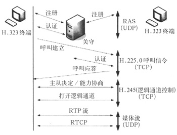 H.323終端之間建立通信關系通常執(zhí)行四個控制過程:RAS,H.225.0呼叫控制(Q.931信令),連接控制(H.245)及媒體RTP信道建立的過程。