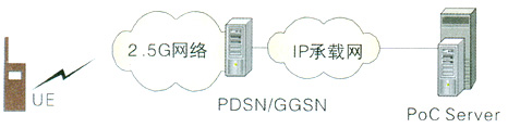 PS方案指直接在GPRS或CDMA 1X核心網(wǎng)絡(luò)上增加PoC服務(wù)器來實現(xiàn)PoC業(yè)務(wù);這種方案是國際標(biāo)準(zhǔn)發(fā)布之前的普遍方案。該方案結(jié)構(gòu)簡單,成本低,PoC服務(wù)器直接與GGSN/PDSN相連,負(fù)責(zé)PoC業(yè)務(wù)的提供,其網(wǎng)絡(luò)結(jié)構(gòu)如圖3所示: