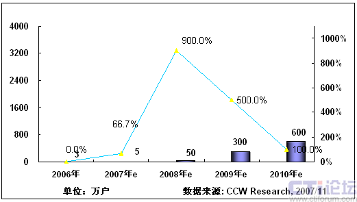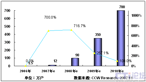 2008年,隨著3G在中國(guó)商用,以及奧運(yùn)帶來(lái)豐富視頻內(nèi)容,將推動(dòng)手機(jī)電視作為一項(xiàng)重要的移動(dòng)增值業(yè)務(wù)將進(jìn)入市場(chǎng)發(fā)展期;同時(shí)隨著網(wǎng)絡(luò)、終端、內(nèi)容、商業(yè)模式等因素的發(fā)展,產(chǎn)業(yè)鏈初步完善,看好手機(jī)電視業(yè)務(wù)的產(chǎn)業(yè)鏈各環(huán)節(jié)大力介入,北京奧運(yùn)會(huì)將大大激發(fā)用戶使用手機(jī)電視業(yè)務(wù)的熱情,從而推動(dòng)手機(jī)電視進(jìn)入快速發(fā)展階段。根據(jù)計(jì)世資訊預(yù)計(jì),2008年中國(guó)手機(jī)電視用戶將達(dá)到400萬(wàn)。