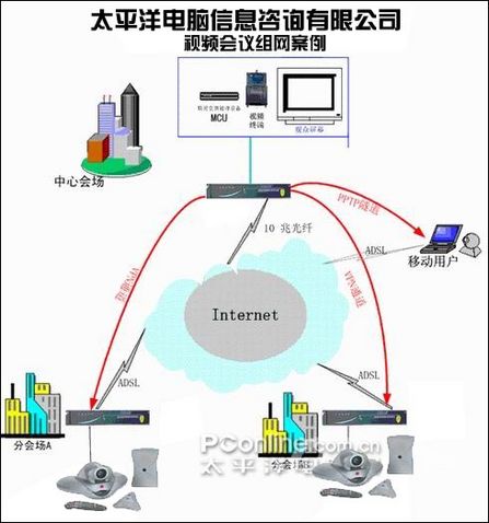 太平洋電腦網(wǎng)廣州總公司視頻會(huì)議設(shè)備連接在廣州中心的局域網(wǎng)上,其它點(diǎn)的視頻設(shè)備也連接到各自分站的局域網(wǎng)上。視頻會(huì)議的各種數(shù)據(jù)從各地視頻終端發(fā)起,通過VPN網(wǎng)來到中心會(huì)場(chǎng)視頻會(huì)議數(shù)據(jù)交換處理設(shè)備MCU,太平洋電腦網(wǎng)的MCU具有極強(qiáng)的處理能力,在處理后的數(shù)據(jù)分發(fā)給各視頻終端,這樣就實(shí)現(xiàn)了整視頻會(huì)議的聲音、圖象等的實(shí)時(shí)交互。在廣州主會(huì)場(chǎng)和各個(gè)分會(huì)場(chǎng)各放置一臺(tái)高端路由器,從而實(shí)現(xiàn)有效節(jié)約各分布的區(qū)間電話費(fèi)用支出,同時(shí)達(dá)到視頻會(huì)議的目的。
