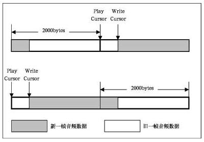從理論上講,這已經保證了音頻回放的流暢性。但在實現(xiàn)過程中,由于操作的對象是一幀的音頻數(shù)據,其回放的時間僅是0.25秒,所以必須考慮的一個問題是程序的反應速度問題。如果忽略由事件觸發(fā)到真正用Lock函數(shù)鎖定緩沖區(qū)的部分以進行新數(shù)據寫入之間的時間,則這種實現(xiàn)方法沒有任何問題。除了最開始的兩幀數(shù)據外,新的一幀數(shù)據會緊跟在前一幀數(shù)據之后,彼此之間沒有重疊部分,也沒有空隙存在,能很好地達到音頻回放的流暢效果。但事實上,由事件觸發(fā)到真正用Lock函數(shù)鎖定緩沖區(qū)的部分以進行新數(shù)據的寫入之間還必須經過線程監(jiān)聽到事件,分析事件對應的緩沖區(qū),然后再觸發(fā)相應的回調函數(shù)來進行