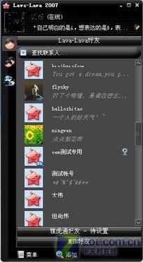 而Lava-Lava更是將整合功能發(fā)揮得淋漓盡致。上了Lava-Lava,還得惦記著MSN和雅虎通的好友,都登錄吧,不僅占用內(nèi)存資源還嫌麻煩,現(xiàn)在不用再發(fā)愁了,新版lava不僅已經(jīng)集成了MSN好友分組,還可以與雅虎通的好友互通,以后能在lava-lava上直接與MSN或雅虎通好友交流了。操作方法相當(dāng)簡單,在你的主界面,添加MSN和雅虎通好友分組即可(圖14)。