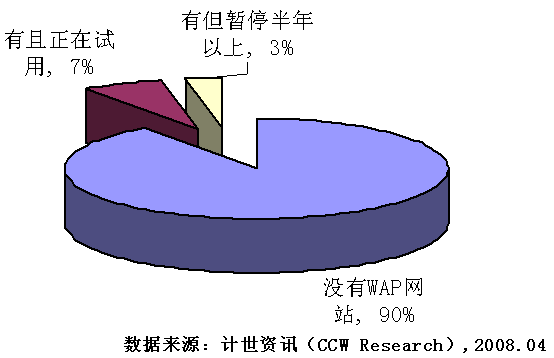 2008年3月至4月,計(jì)世資訊(CCW Research)就企業(yè)WAP網(wǎng)站建設(shè)情況對(duì)北京71家企業(yè)進(jìn)行調(diào)研,這些企業(yè)大多分布在互聯(lián)網(wǎng)、IT、電信等行業(yè)。從調(diào)研結(jié)果來(lái)看,企業(yè)WAP應(yīng)用還處于初級(jí)階段,71家企業(yè)中只有7家擁有自己的WAP網(wǎng)站,其中有兩家企業(yè)的WAP網(wǎng)站已經(jīng)暫停使用超過(guò)了半年。接受訪談的71家企業(yè)無(wú)一例外的都有自己的WEB網(wǎng)站,與企業(yè)WEB網(wǎng)站相比,企業(yè)WAP網(wǎng)站普及程度還很低。