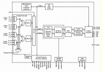 圖2所示為視頻解碼器的數(shù)據(jù)流路徑,它負(fù)責(zé)處理NTSC、PAL、SECAM、S-Video、SCART、YPbPr、RGB、480p和其它輸入格式。在數(shù)字電視中,對這種級別的靈活性的支持是必需的,完全是為了讓一個機型經(jīng)過實際設(shè)置可以工作于任何格式。數(shù)字電視解碼器的典型性能特征包括:同步、消隱、場、有源視頻窗口、水平和垂直同步、時鐘、同步鎖相(用于下行視頻編碼同步)、主CPU中斷和可編程邏輯I/O信號。這是對數(shù)字視頻輸出以及用于先進的垂直消隱期(VBI)數(shù)據(jù)恢復(fù)的補充。作為一種附加功能,一些視頻解碼器支持VBI數(shù)據(jù)處理器(VDP)在文字電視廣播、傳送字幕(CC)和其它VBI數(shù)據(jù)上進行數(shù)據(jù)分片、解析和執(zhí)行誤碼校驗。內(nèi)置的FIFO存儲多達11行文字電視廣播數(shù)據(jù),而適當(dāng)?shù)闹鹘涌谕郊叭聊晃淖蛛娨晱V播恢復(fù)是當(dāng)今系統(tǒng)中的幾個常見要求。然而,一些實現(xiàn)方案需要一種解碼器,它能夠為基于主CPU的VBI處理提供速度為已采樣原始亮度數(shù)據(jù)兩倍的輸出格式化數(shù)據(jù)。