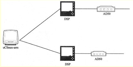下一代媒體網(wǎng)關(guān)系統(tǒng)主要由媒體網(wǎng)關(guān)、媒體網(wǎng)關(guān)控制器和信令網(wǎng)關(guān)組成,實現(xiàn)了功能上的分解。為了適應(yīng)不同的網(wǎng)絡(luò),本文主要介紹了媒體網(wǎng)關(guān)的實現(xiàn)方法,其中媒體網(wǎng)關(guān)的主要作用是實現(xiàn)模擬信號由電路交換轉(zhuǎn)換成數(shù)字信號PCM編碼,并進行G.711或者G.723等格式編碼。為了實現(xiàn)媒體網(wǎng)關(guān),整個系統(tǒng)由3部分組成,包括基于ARM架構(gòu)的嵌入式系統(tǒng)(uClinux)、語音信號轉(zhuǎn)換芯片(TLC320AD50)和定點數(shù)字信號處理器(TMS320VC54xx),如圖3所示。