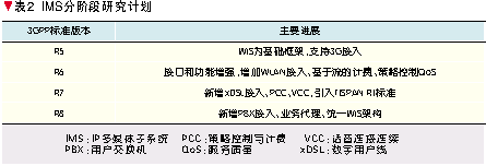 3GPP依照UMTS 3G移動通信系統(tǒng)的系列標(biāo)準(zhǔn)版本定義了IMS的分階段演進(jìn)計(jì)劃[5],如表2所示。其中,2002年完成的R5是第一個全I(xiàn)P移動網(wǎng)絡(luò)標(biāo)準(zhǔn),它將核心網(wǎng)歸為一個統(tǒng)一的基于IP的分組(PS)域,具有服務(wù)質(zhì)量(QoS)保證,能夠提供各種類型的多媒體增值業(yè)務(wù),其核心技術(shù)標(biāo)準(zhǔn)就是IMS。R6進(jìn)一步完善IMS接口和功能,增加對于WLAN的接入支持,并研究IMS域的計(jì)費(fèi)和QoS控制技術(shù)。R7融合TISPAN關(guān)于NGN的研究標(biāo)準(zhǔn),增加對于xDSL接入技術(shù)的支持,提出策略控制與計(jì)費(fèi)(PCC)技術(shù)以及WLAN/3G語音連續(xù)通信的話音連接連續(xù)(VCC)技術(shù)。正在研究中的R8將協(xié)同各個標(biāo)準(zhǔn)化組織的工作,研究支持組合業(yè)務(wù)的業(yè)務(wù)代理技術(shù)以及下一步的統(tǒng)一IMS架構(gòu)。