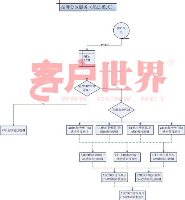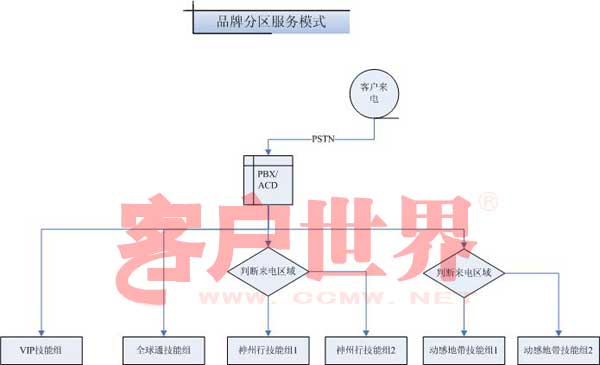 該模式也是按照服務品牌來進行技能組的劃分,所不同的是對于話務量較大的神州行和動感地帶在技能組內(nèi)部再按來電區(qū)域分為二個小組,每個小組的座席代表負責接聽5-8個地市的該品牌用戶來電,同樣技能組與技能組之間不能進行話務溢出(見圖二)。