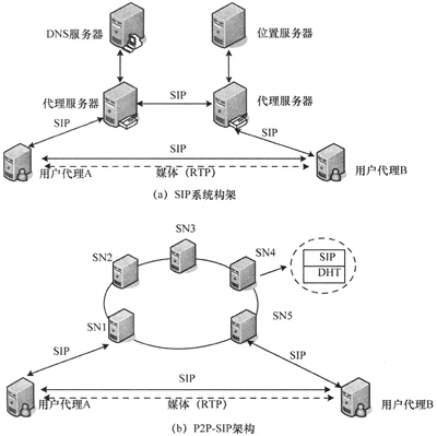 圖1 SIP系統(tǒng)架構和P2P-SIP架構比較