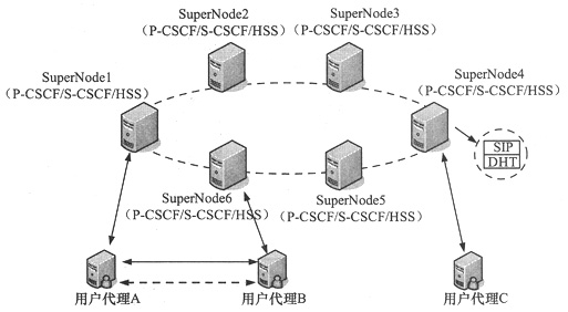 在分布式IMS架構中,每一個SuperNode都包含兩類功能:基于DHT的HSS功能和基于SIP的會話控制功能;赟IP的會話控制功能包括P-CSCF功能和S-CSCF功能,P-CSCF為用戶代理接入到系統(tǒng)中的入口點,S-CSCF扮演歸屬地會話控制的角色。P-CSCF和S-CSCF的功能和3GPP