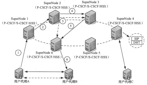 。3)在SuperNode2上,SuperNode2能夠識別會話請求為自己所控制的用戶的會話請求,執(zhí)行S-CSCF功能,完成業(yè)務的觸發(fā)和控制。在執(zhí)行S-CSCF功能之后,SuperNode3向基于DHT的HSS功能請求被叫用戶的S-CSCF功能所在的位置。