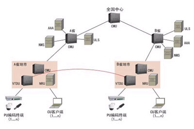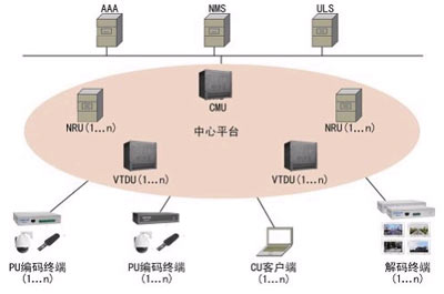 單級(jí)系統(tǒng)組網(wǎng)架構(gòu)如上圖所示。主要包括前端單元PU、客戶(hù)端單元CU、中心平臺(tái)(包括CMU、VTDU、NRU)以及支撐系統(tǒng)(包括AAA、ULS和NMS),各部分均接入IP