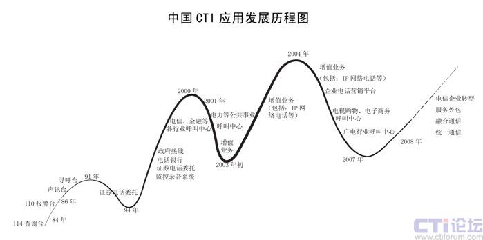 CTI在中國已經(jīng)發(fā)展了二十多年,已經(jīng)從最早的電信行業(yè)CTI應(yīng)用發(fā)展到金融(包括銀行、保險(xiǎn)、證劵及基金)、電力、郵政、企業(yè)(包括煙草、汽車、家電、IT、互聯(lián)網(wǎng)、旅游、報(bào)業(yè)、航空、物流、醫(yī)療、公共事業(yè)等)、政府、軍隊(duì)等各行各業(yè)的應(yīng)用。特別在1995年到2001時(shí)期,是CTI應(yīng)用發(fā)展最快,普及面最廣的時(shí)期,也是CTI市場進(jìn)入了第二次高潮;從2002開始增值業(yè)務(wù)是整個(gè)CTI行業(yè)的突破口,整個(gè)行業(yè)以增值業(yè)務(wù)為主,CTI市場進(jìn)入了第三次高潮;從2006年開始,增值業(yè)務(wù)進(jìn)入了衰退期,整個(gè)CTI行業(yè)市場出現(xiàn)了嚴(yán)重的危機(jī),加上新的技術(shù)出現(xiàn),技術(shù)的換代,對原來的傳統(tǒng)語音產(chǎn)品和公司是個(gè)致命的打擊。