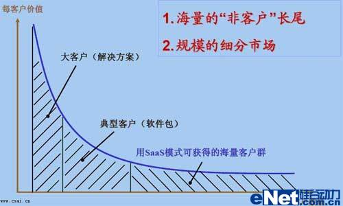SaaS模式就是不論是什么樣的客戶都向其提供服務(wù),不論服務(wù)的時間長短,不論身處何地。傳統(tǒng)軟件是很難適應(yīng)普通客戶的,普通客戶付不出更多的投資,也不想軟件、硬件、服務(wù)都全面去投資,這樣就只有放棄使用軟件了。自然,軟件市場就少了一大群消費者。而SaaS模式將不細(xì)分客戶類型,讓人人都可使用軟件,讓個個都消費得起軟件?上攵@是一個怎么龐大的市場。如下圖所示: