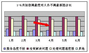 客服代表的工作情緒及客戶滿意度呈現(xiàn)上升趨勢(shì):3-6月的短信滿意度穩(wěn)步提升(見下圖1),6月短信滿意度較3月提升1.25個(gè)百分點(diǎn),短信滿意度調(diào)查中“非常滿意”項(xiàng)占比自4月份開上升1.42個(gè)百分點(diǎn)(見下圖2)。從客戶不滿意原因情況看,由于人員導(dǎo)致客戶不滿意的比例下降0.6%(見下圖3);對(duì)導(dǎo)致人員不滿意的原因分析可知,話務(wù)員服務(wù)態(tài)度不好的占比有明顯的下降(見下圖4)。