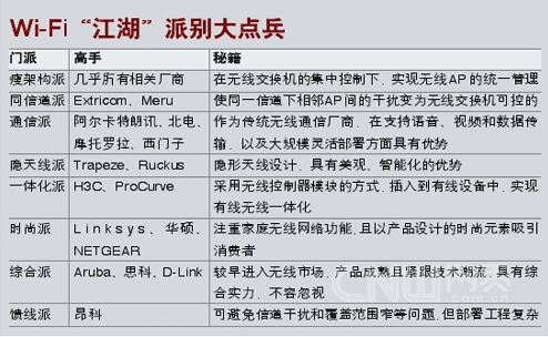 少林、武當(dāng)、華山、峨嵋、丐幫……眾多門派共同支撐起了武俠小說(shuō)當(dāng)中的“江湖”。而在無(wú)線網(wǎng)絡(luò)的“江湖”上,其實(shí)也存在著很多門派:比如瘦架構(gòu)派、同信道派、一體化派、通信派、隱天線派、時(shí)尚派等,各家廠商都有自己的看家本事,在極大豐富了無(wú)線產(chǎn)品,更好滿足了用戶需求的同時(shí),也促進(jìn)了無(wú)線技術(shù)在多個(gè)層面上的深入發(fā)展。