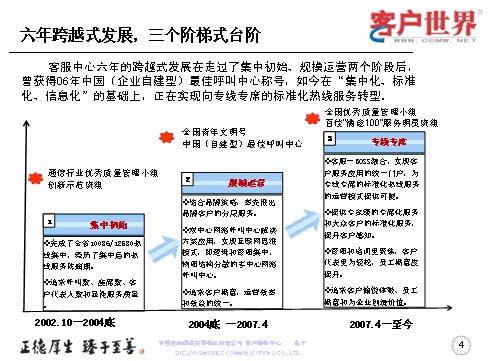 六年的跨越式發(fā)展,走過了集中初始,規(guī)模運(yùn)營兩個(gè)階段。曾經(jīng)獲得也是今天主辦方的06年中國(企業(yè)自建型)最佳呼叫中心稱號(hào)。如今在集中化、標(biāo)準(zhǔn)化、信息化的基礎(chǔ)上,正在向?qū)>專席標(biāo)準(zhǔn)化的熱線服務(wù)轉(zhuǎn)型。