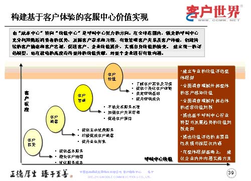 最后我想世界級(jí)的呼叫中心戰(zhàn)略是我們從事客戶服務(wù)行業(yè),從事呼叫中心人的方向,從我們理解的世界級(jí)呼叫中心特征來講,管理團(tuán)隊(duì)?wèi)?yīng)對(duì)呼叫中心的運(yùn)營原理有系統(tǒng)的理解,并貼切地應(yīng)用到業(yè)務(wù)實(shí)踐,創(chuàng)造積極向上的工作氛圍,鼓勵(lì)員工成長,能夠闡述呼叫中心的戰(zhàn)略價(jià)值,制訂并達(dá)到本部門的目標(biāo),為企業(yè)利潤的增長作出杰出的貢獻(xiàn),杰出的員工滿意度和客戶滿意度。所以世界級(jí)呼叫中心我們理解是從七個(gè)方面來衡量,以“客戶為中心”,多種客戶溝通的聯(lián)絡(luò)渠道,低員工流失率和高客戶滿意度,高效率、低成本,高“一次性解決率”,對(duì)客戶服務(wù)請(qǐng)求的快速反應(yīng)與處理,技術(shù)驅(qū)動(dòng)與創(chuàng)新。