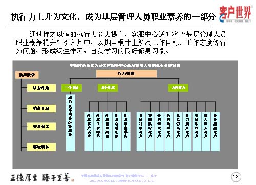 在執(zhí)行力上升文化的同時(shí),基層管理者的職業(yè)素養(yǎng)是我們時(shí)刻去追求的,所以客服中心適時(shí)地將基層管理人員的職業(yè)素養(yǎng)引入到其中,以期從根本上解決工作目標(biāo)、工作態(tài)度等問題,形成終生學(xué)習(xí),自我學(xué)習(xí)的良好修身習(xí)慣。這是我們客服中心基層管理人員職業(yè)素養(yǎng)的一個(gè)體系圖,首先從素養(yǎng)要求的四個(gè)維度,行為準(zhǔn)則的一、五、九來展現(xiàn)。一個(gè)目標(biāo)是成為優(yōu)秀的管理者,五個(gè)注重是注重客戶需求、注重工作細(xì)節(jié)、注重團(tuán)隊(duì)建設(shè)、注重總結(jié)匯報(bào)、注重制度落實(shí)。九種能力:目標(biāo)計(jì)劃能力,貫徹執(zhí)行能力、分析解決能力、協(xié)調(diào)溝通能力、總結(jié)創(chuàng)新能力、時(shí)間管理能力、師人育人能力和標(biāo)桿超越能力。這個(gè)一、五、九,讓它彰顯出素養(yǎng)和表現(xiàn)的四個(gè)維度,以身作則、培育下屬、關(guān)愛員工和鍛造團(tuán)隊(duì)。