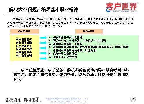 一線客服人員如何來全面提升職業(yè)能力,首先是解決一線客服人員的六個(gè)問題,剛才已經(jīng)跟大家交流了客服中心一線人員的人員結(jié)構(gòu),當(dāng)前的六個(gè)主要問題可以用簡單的幾個(gè)方面來表述:對(duì)生活沒有明確的目標(biāo)、對(duì)自己不進(jìn)取、對(duì)工作不負(fù)責(zé)、對(duì)同事不合作、對(duì)顧客不關(guān)心、對(duì)企業(yè)不忠誠,這是在日常工作中,一線人員所存在的問題。而針對(duì)這些問題,我們要用工作目標(biāo)去持續(xù)解決和克服問題,所以我們采取的是讓大家明確企業(yè)目標(biāo)與個(gè)人使命,用積極的心態(tài)自主自發(fā),主動(dòng)積極和個(gè)人領(lǐng)導(dǎo);良好的工作態(tài)度責(zé)任心,良好的團(tuán)隊(duì)合作氛圍;熟練掌握溝通技巧和方法,牢固樹立顧客滿意的意識(shí),以客為尊;良好的行為素質(zhì)習(xí)慣,自我學(xué)習(xí),終身學(xué)習(xí)。從而在中國移動(dòng)集團(tuán)“正德厚生、臻于至善”的核心價(jià)值觀指導(dǎo)下,結(jié)合呼叫中心特點(diǎn),確定誠實(shí)務(wù)信,愛崗敬業(yè),以客為尊、團(tuán)隊(duì)合作的團(tuán)隊(duì)文化。