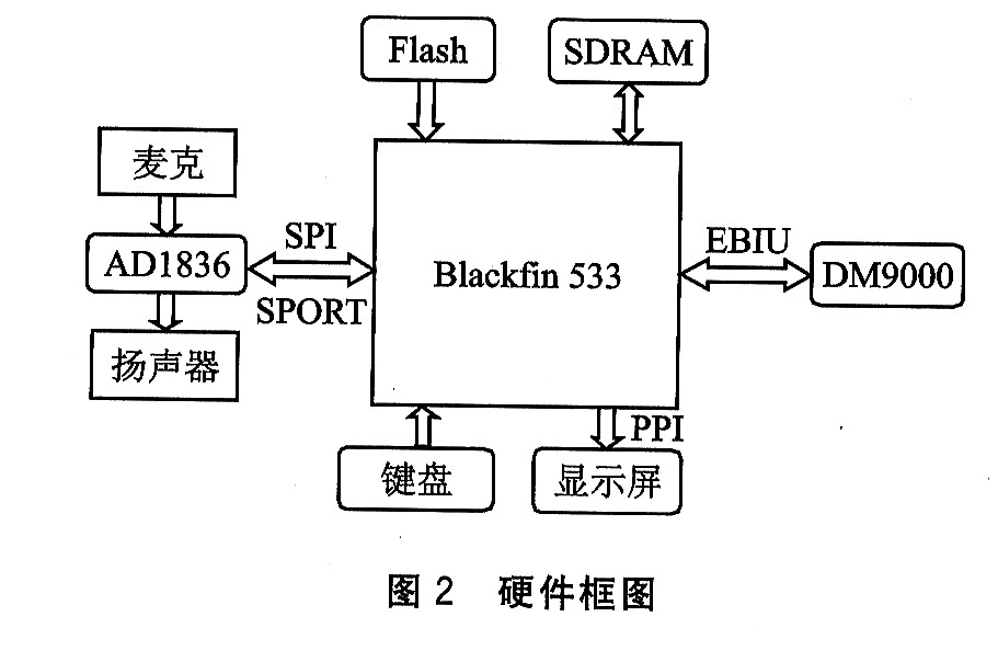Blackfin 533為核心處理器芯片。外圍輔以ADl836實現(xiàn)語音信號的采集和播放;DM9000實現(xiàn)網(wǎng)絡數(shù)據(jù)包的收發(fā);TFT