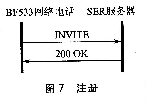 注冊過程如圖7所示。BF533網(wǎng)絡電話和SER服務器共交換了兩條消息:一條是目標系統(tǒng)向服務器發(fā)送的REGISTER請求消息,另一條是服務器發(fā)送的200