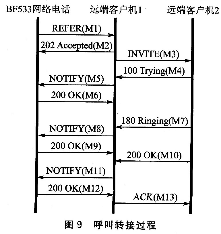 該過程是通過擴展的SIP信令REFER來完成的,交互過程如圖9所示。當BF533網(wǎng)絡電話要將它和遠端客戶機1(RCl)的通話轉接到遠端客戶機2(RC2)時,BF發(fā)送REFER(M1)給RCl,該信息中Refer—To字頭標明了RC2的URL,之后RCl回復202