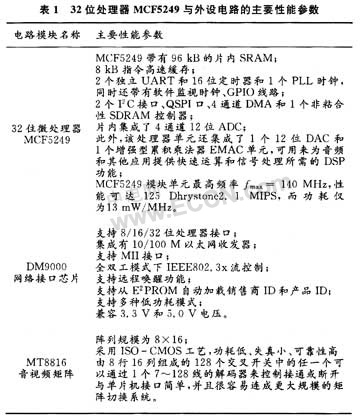 MCF5249模塊單元主要由32位處理器MCF5249和若于外圍器件AM29LV160DB90快閃存儲(chǔ)器、K4S281632SDRAM、SP3223串行通訊電路、DM9000網(wǎng)絡(luò)接口芯片、MT8816音視頻矩陣電路等硬件構(gòu)成。其主要性能如下表1所示。