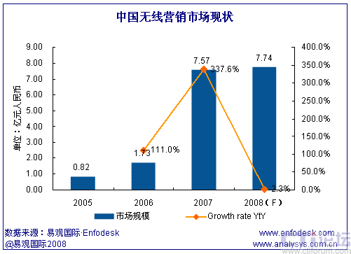 易觀國際(Analysys International)研究發(fā)現,中國無線營銷市場經過2007年的高速發(fā)展后,2008年已經進入了商業(yè)模式探索階段,從市場規(guī)模上看,2008年全年無線營銷市場規(guī)模僅比上年增長2.3%。易觀國際(Analysys International)認為,無線營銷市場增速的明顯放緩主要由于短信廣告市場的萎縮,短信廣告是無線營銷市場最大的細分領域,2007年曾經占整個無線營銷市場規(guī)模的72.7%。